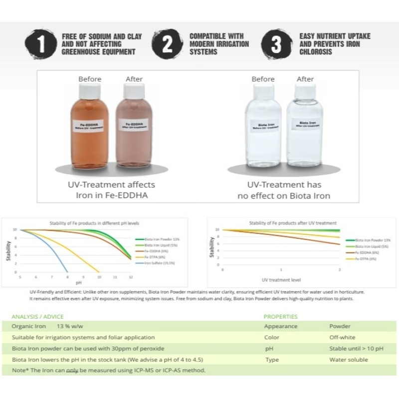 Biota Iron Powder is an Iron micronutrient supplement. It is organically stabilized and is a great Iron source for any crop. The product is easily soluble, very stable in solution, easily absorbable by the plant and suitable for all modern irrigation systems.